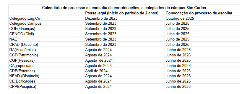 Calendário do processo de consulta das coordenações e colegiados do câmpus São Carlos