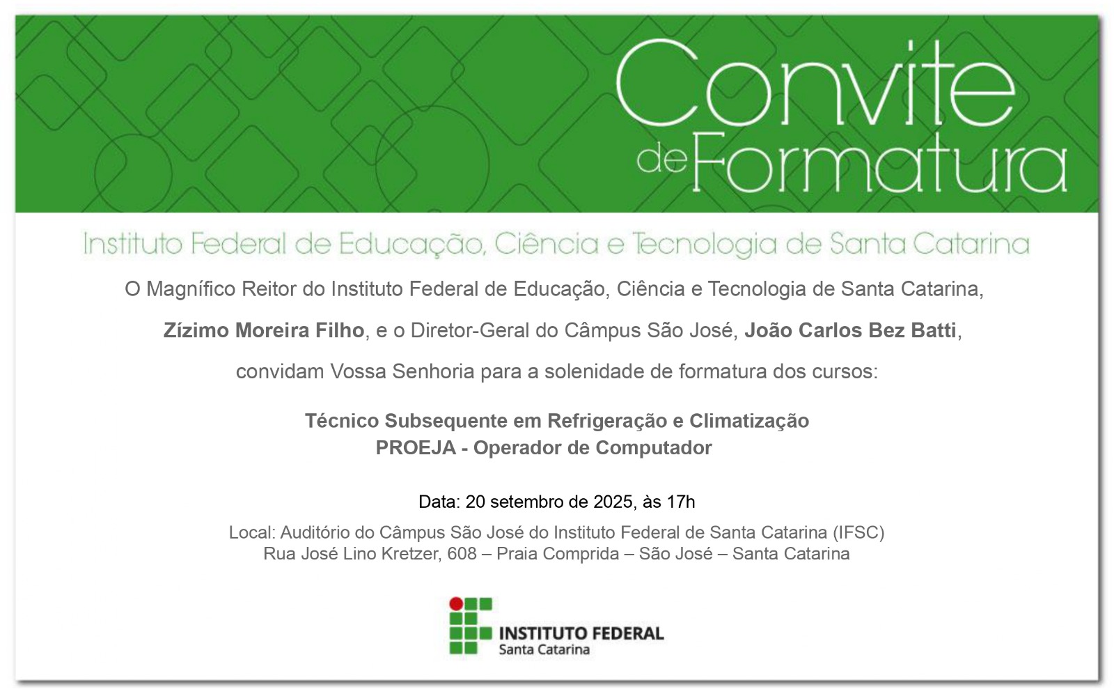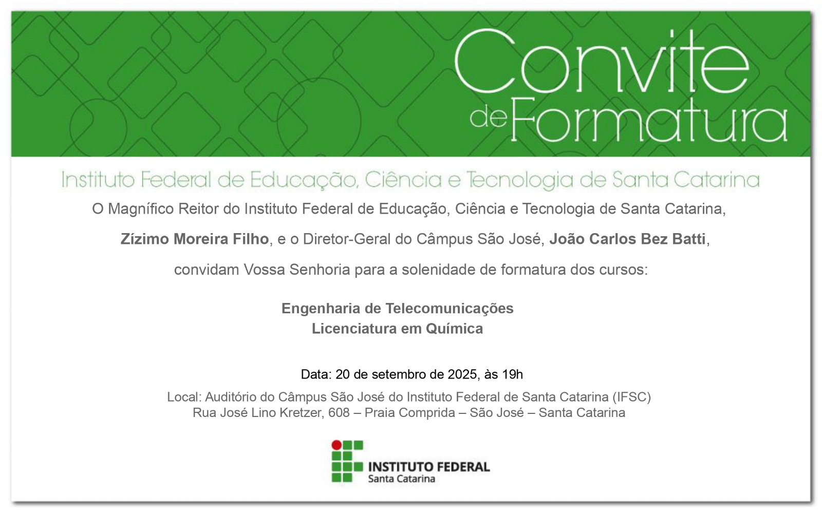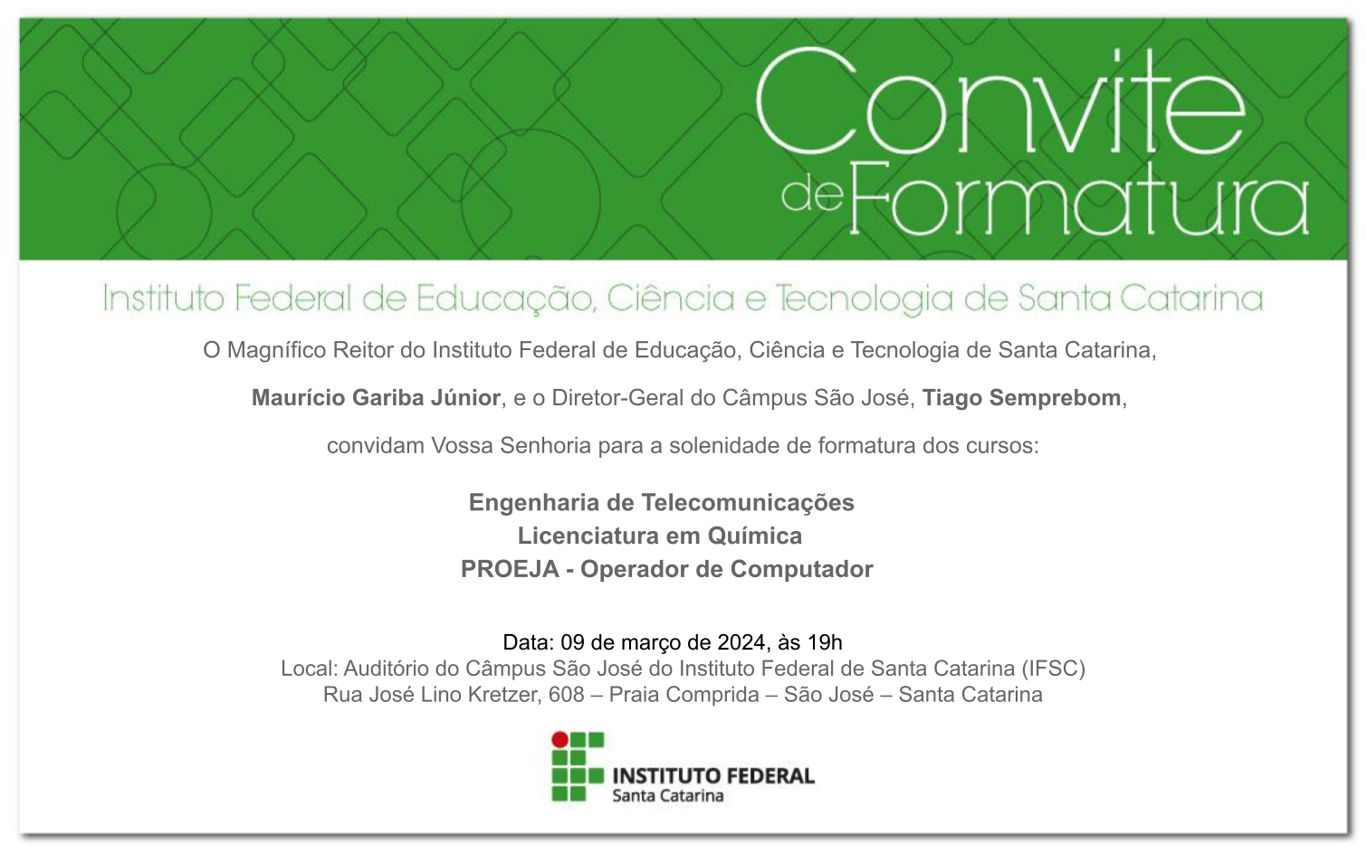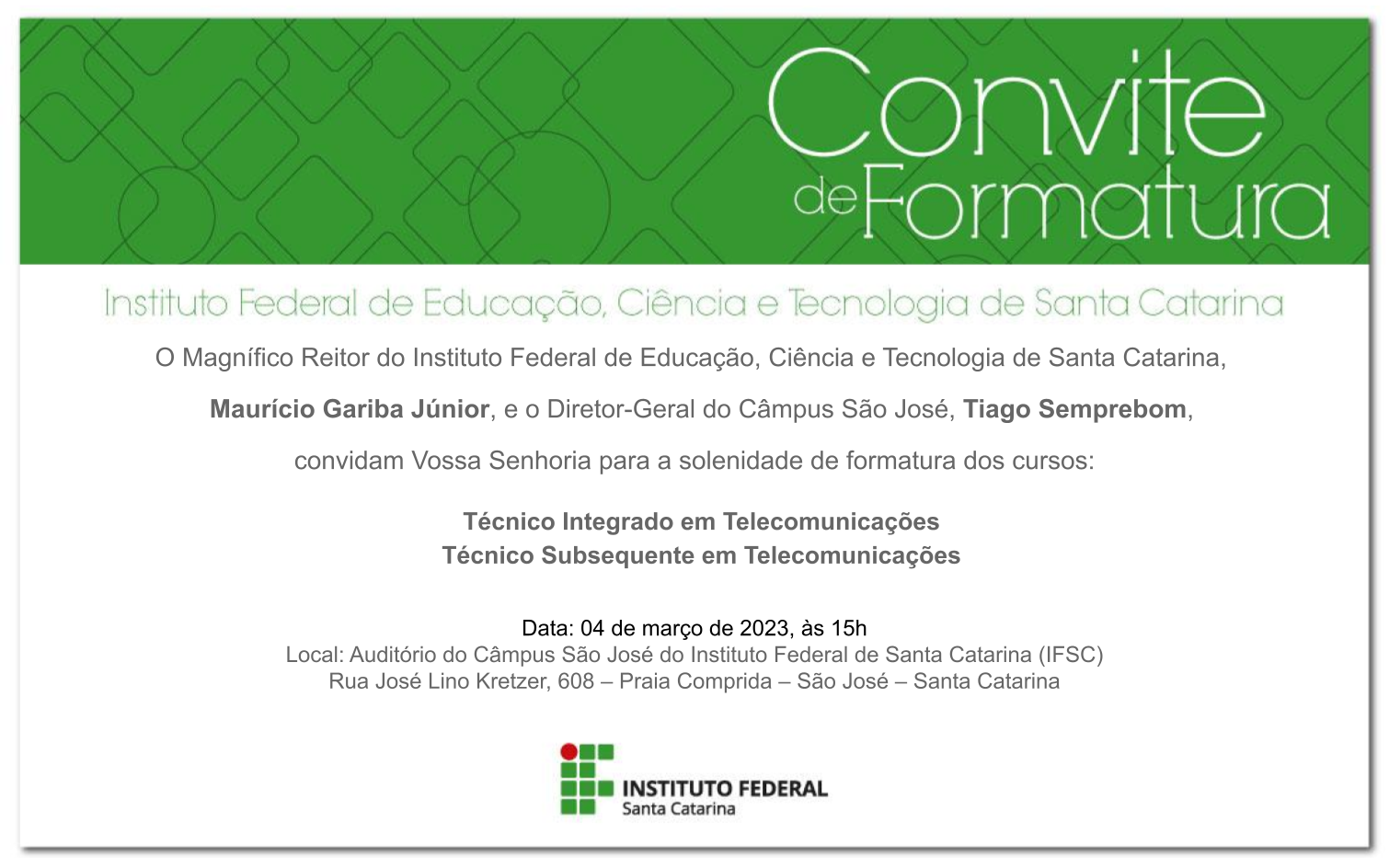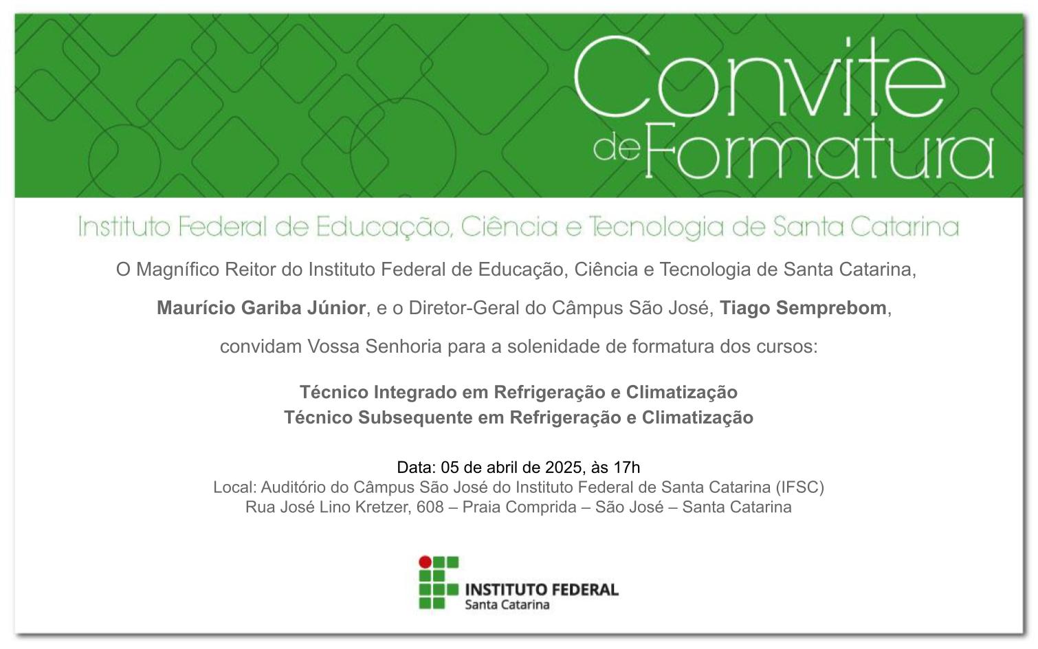 Confira abaixo documentos importantes das formaturas do Câmpus São José.
