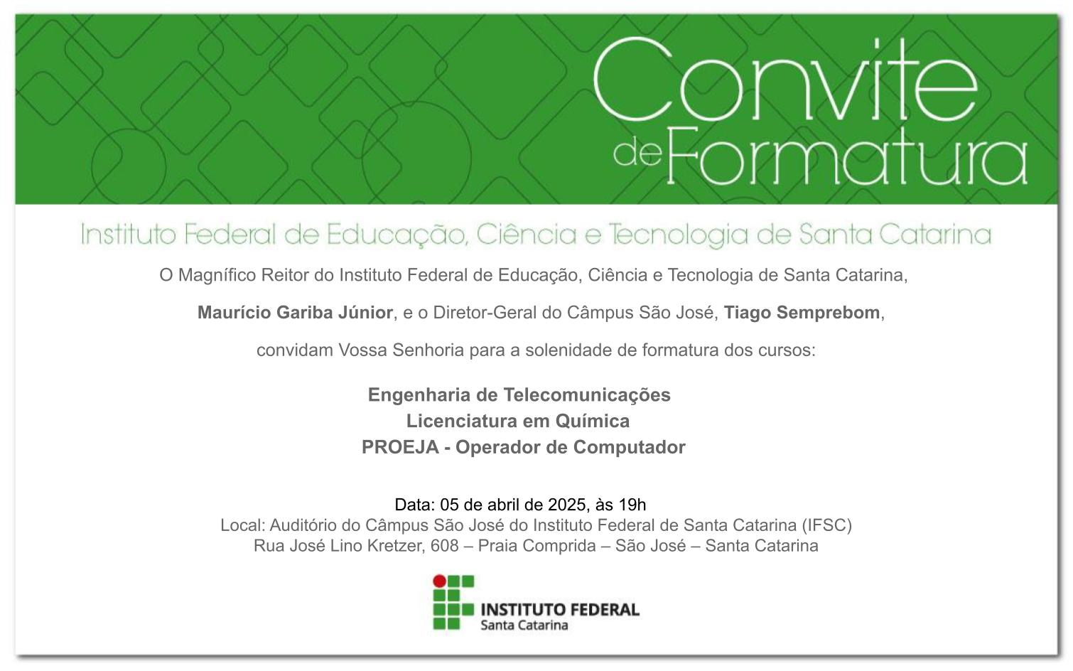 O Câmpus São José oportuniza a todos os formandos a solenidade de formatura sem qualquer custo. Para que esse importante evento tenha sucesso é fundamental que haja planejamento e sejam seguidas determinadas normas de protocolo, de acordo com as orientações estabelecidas.