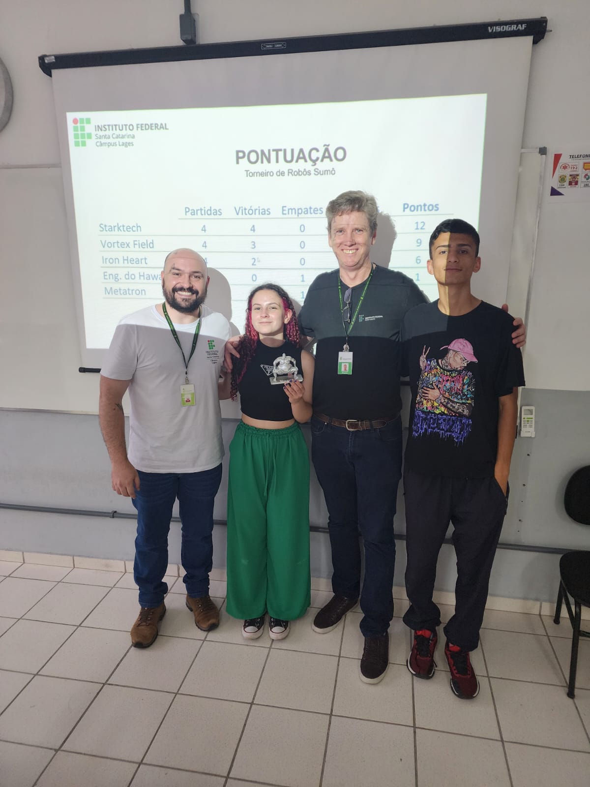 “Acredito que o torneio foi uma ótima iniciativa, pois promove integração, prática tecnológica e criatividade entre os alunos. Fiquei muito feliz em participar e conquistar o primeiro lugar, além disso, tenho certeza que esse torneio veio a inspirar os novos alunos do curso técnico em Mecatrônica e que, sem dúvidas, fortaleceu ainda mais o curso no câmpus", conta o estudante Rafael Dolçan, que compunha a equipe campeã, Starktech, junto da aluna Maria Luíza Orso Rocha. Em segundo lugar ficou a equipe Vortex Field, dos alunos Nicolas Kauê da Mota Rates e Vitória Souza de Oliveira.