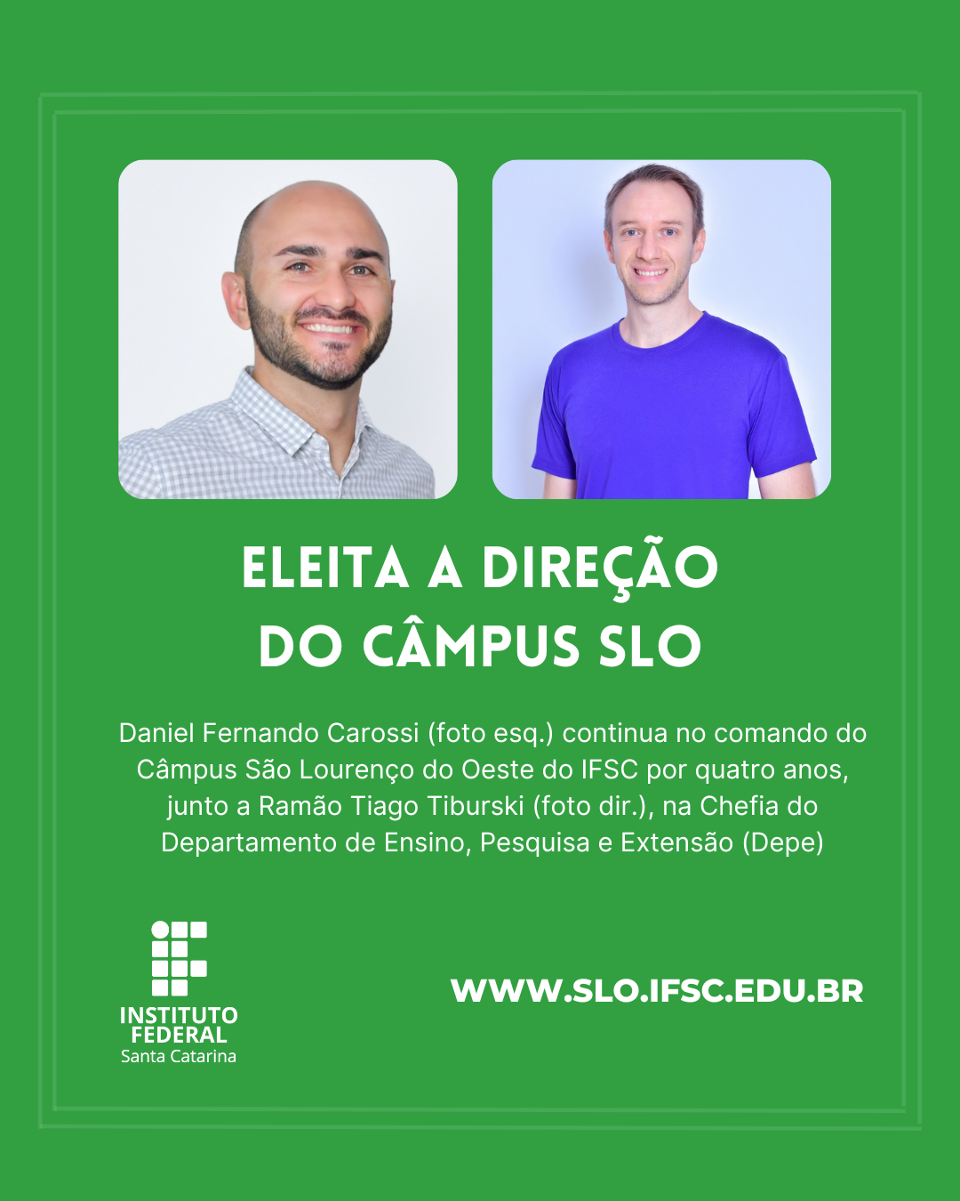 Os estudantes, professores e técnicos-administrativos do Câmpus São Lourenço do Oeste do IFSC votaram na última quinta-feira (15) e elegeram Daniel Fernando Carossi como o diretor-geral que comandará a unidade pelos próximos quatro anos.