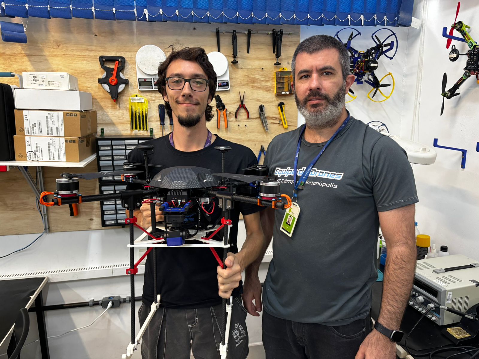 A equipe do IFSC customizou o SplashDrone (prova d'água), substituindo sua eletrônica por soluções próprias e código aberto para estabilidade e baixa latência. “Compraram SplashDrone por ser robusto para mar, mas ele entrava água salgada, caía e estragava. Modificamos a eletrônica interna com nossa expertise para melhorar controle e transmissão”, detalhou Leandro.