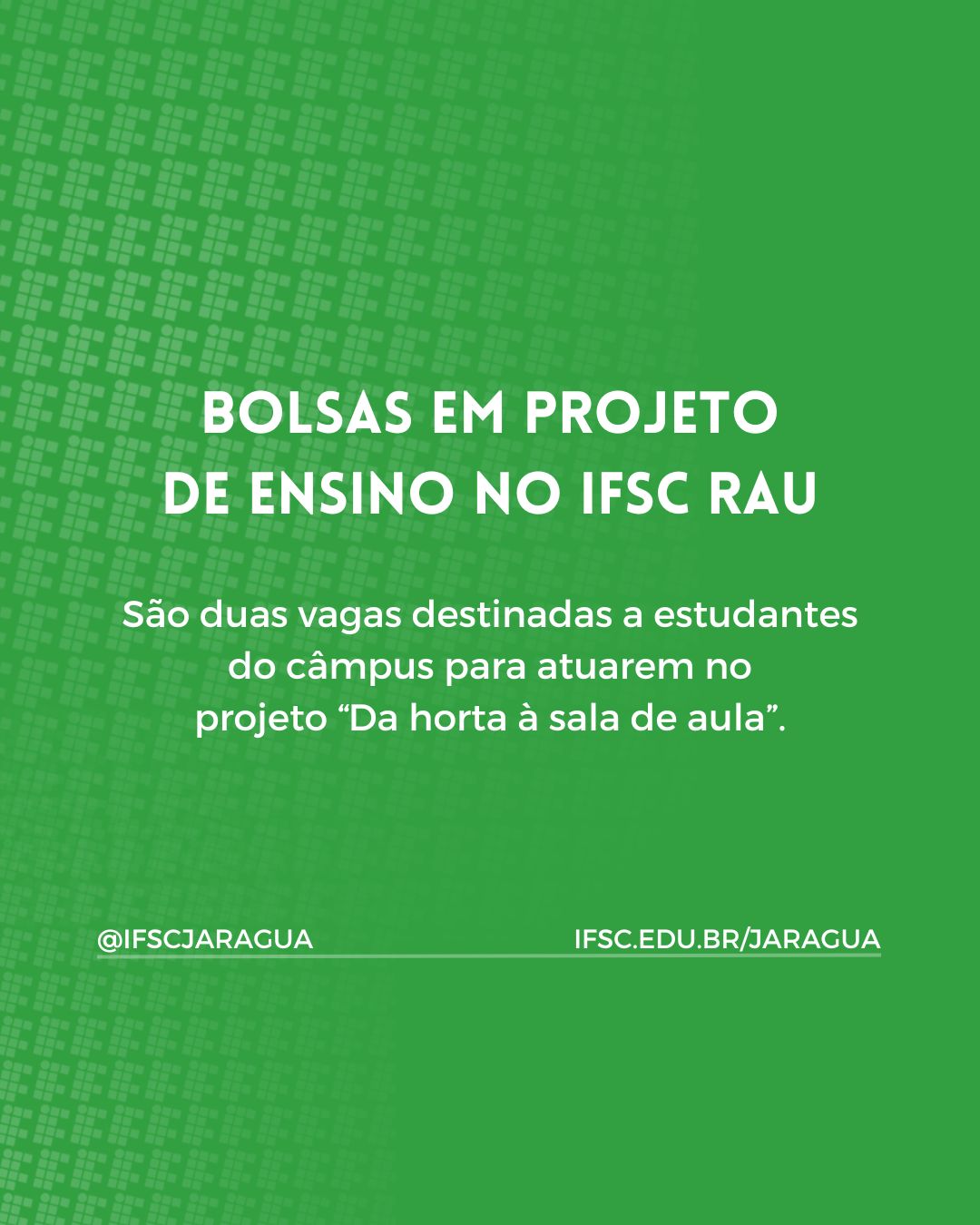 O Câmpus Jaraguá do Sul-Rau do IFSC irá selecionar dois bolsistas para atuação no projeto de ensino “Da horta à sala de aula: trabalhando a educação alimentar e ampliando o domínio da língua portuguesa”. As inscrições ocorrerão de 2 a 6 de junho por meio do formulário eletrônico. As vagas são destinadas a estudantes regularmente matriculados, com carga horária de 10 horas semanais e remuneração mensal de R$ 350,00, conforme informações disponíveis no edital de seleção.