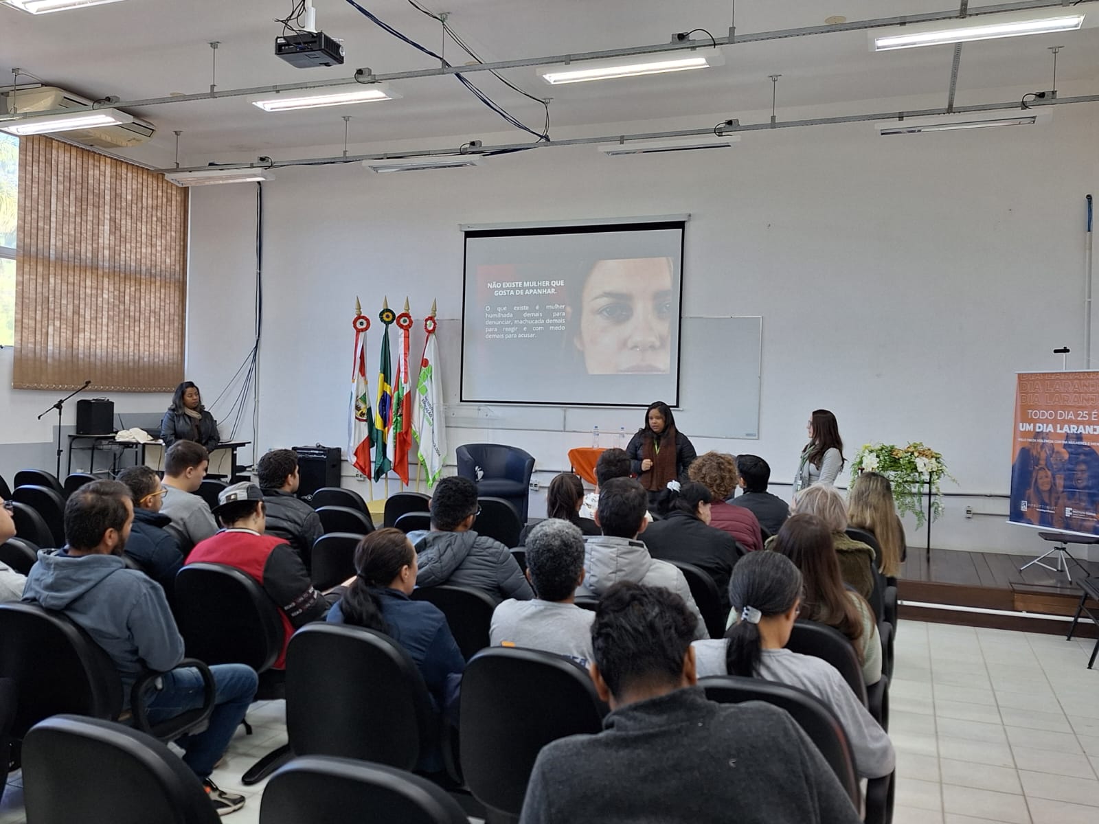 O Câmpus Jaraguá do Sul-Rau do Instituto Federal de Santa Catarina (IFSC) realizou na última sexta-feira (30) uma palestra sobre violência contra mulheres, ministrada pela assistente social Tais Soares do Nascimento e pela psicóloga Crislayne Cardoso Soares, ambas do Creas. A iniciativa fez parte das ações do Dia Laranja, uma campanha global que mobiliza a sociedade no combate à violência contra meninas e mulheres.